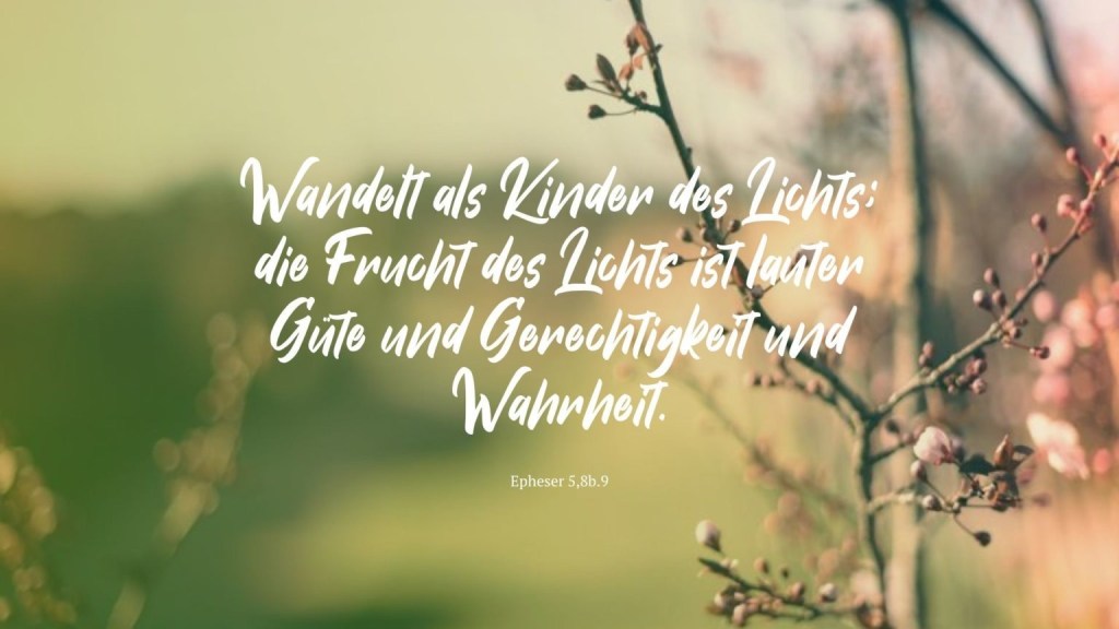 Leben wir also wohlgenährt von Gottes Früchten, so lasst auch unsere Mitmenschen an seine Gaben teilhaben, damit keiner hungern und darben muss. Gedeiht unsere Arbeit durch seinen Segen, „so sollen auch wir ein Segen sein. Denn in uns werden gesegnet alle Geschlechter auf Erden“ (Genesis 12 Vers 2-3). Ist aber Jesus Christ, „das Licht der Welt“ (Johannes 8 Vers 12), so lasst uns selbst zum „Licht der Welt“ werden (Matthäus 5 Vers 14). Gottes Gabe wird somit uns zur Aufgabe: „Lebt als Kinder des Lichts. Die Frucht des Lichtes aber ist lauter Güte und Gerechtigkeit und Wahrheit“ (Epheser 5 Vers 8). Von Gott erleuchtet lasst uns milde die Schwächen unserer Zeitgenossen ertragen. Lasst uns redlich mit denen umgehen, die wir lieben, und mit denen, die uns belasten. Und lasst uns allen Menschen künden von Jesus Christus, „damit jedermann die Wahrheit erkennt. Die Wahrheit aber wird euch frei machen“ (Johannes 8 Vers 32).
